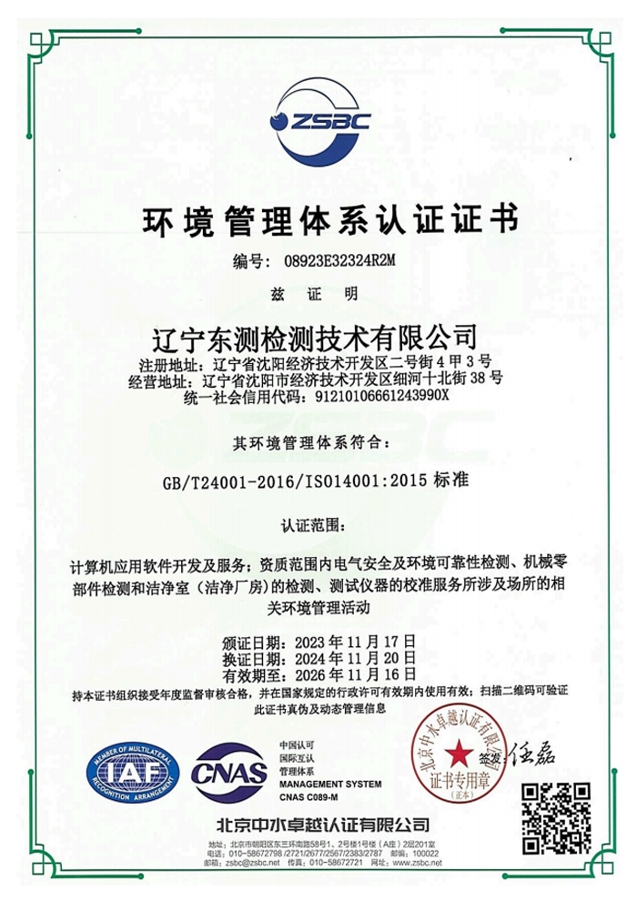 遼寧東測檢測技術有限公司成立于2007年6月21日,專注于為客戶提供計量、檢測以及技術咨詢與培訓的第三方計量檢測機構。遼寧東測檢測技術有限公司通過了中國合格評定國家認可委員會認可(CNAS),獲得檢驗檢測機構資質認定(CMA),憑借著高效的服務網絡、雄厚的技術實力以及全面的業務范圍,本著“科學、公正、準確、真誠”的質量方針,為社會提供優質計量檢測服務,打造國內具有價值的計量技術機構。